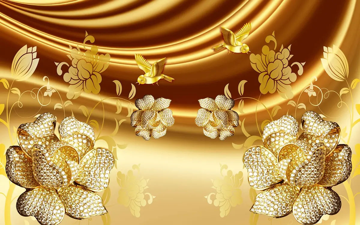 Our Golden Floral 3D Mural Wallpaper showcases an intricate tapestry of golden elements that come together to create a visual symphony: