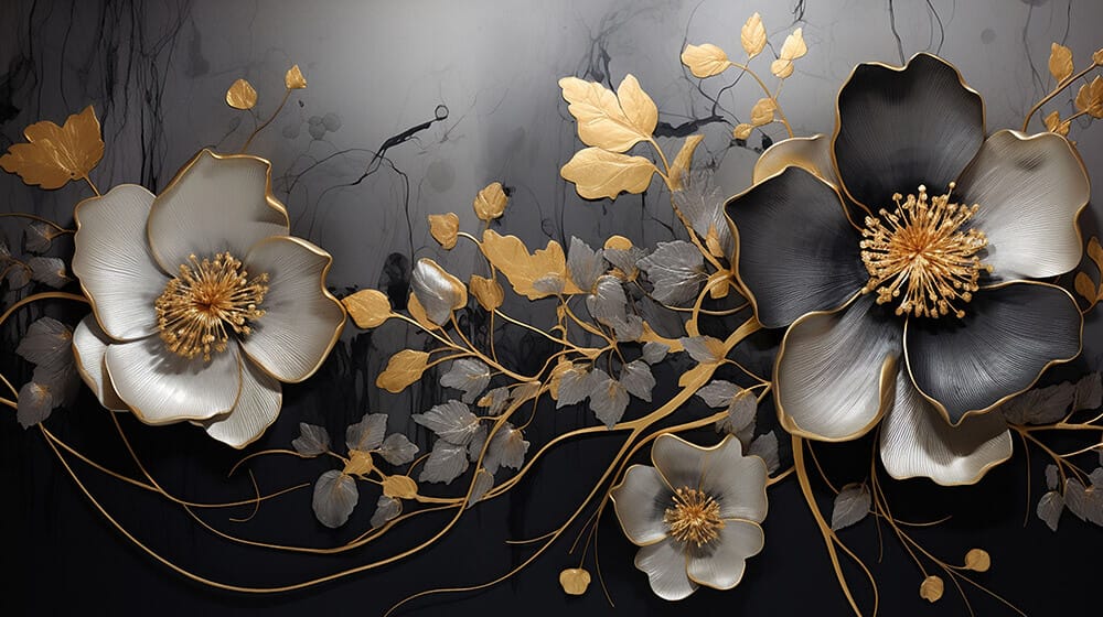Elevate your environment with the Noir Gold Flora 4D Mural Wallpaper, a statement piece that is as environmentally responsible as it is visually impressive, brought to you by the artisans at Mourad Artworks.