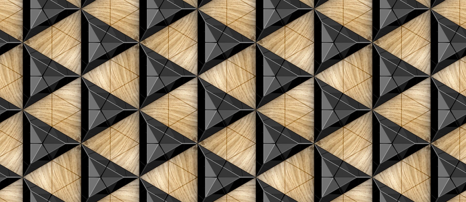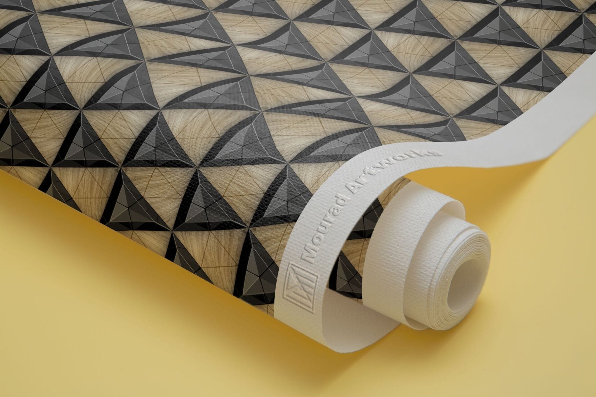 The Black ceramic tiles composite 3D triangles with bevels and simple triangular wood elements 4D Mural Wallpaper from Mourad Artworks is a modern and luxurious design element to any space, this wallpaper adds a touch of glamour and modernity to traditional and contemporary interiors alike.