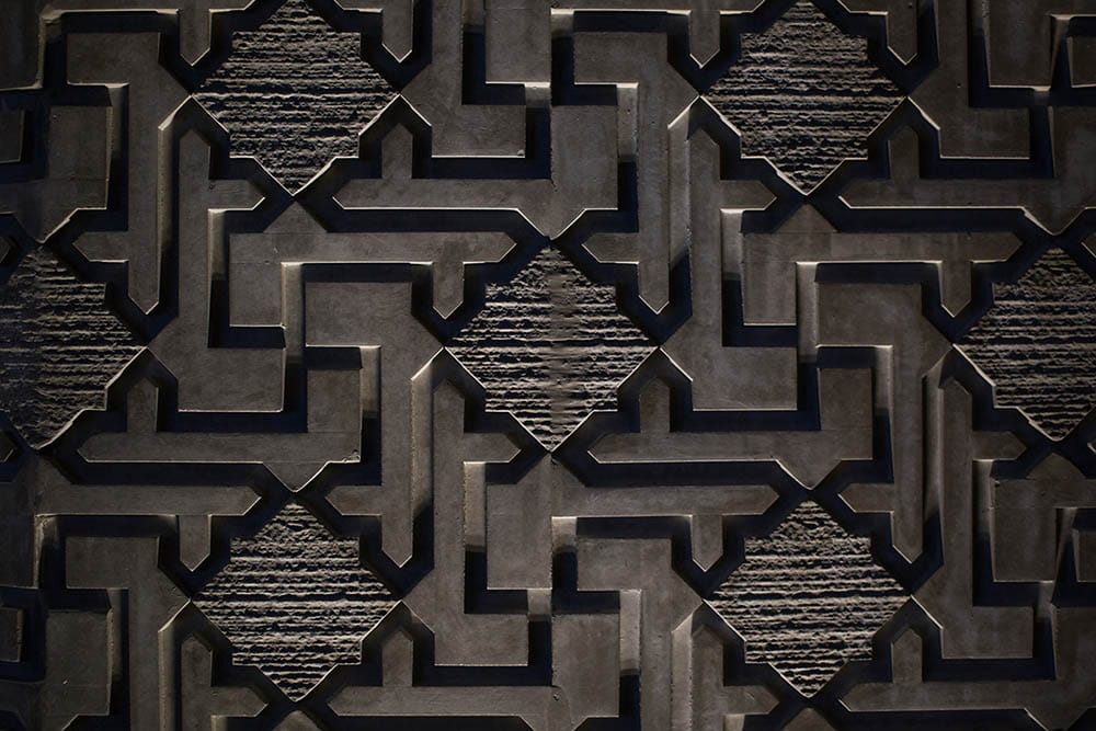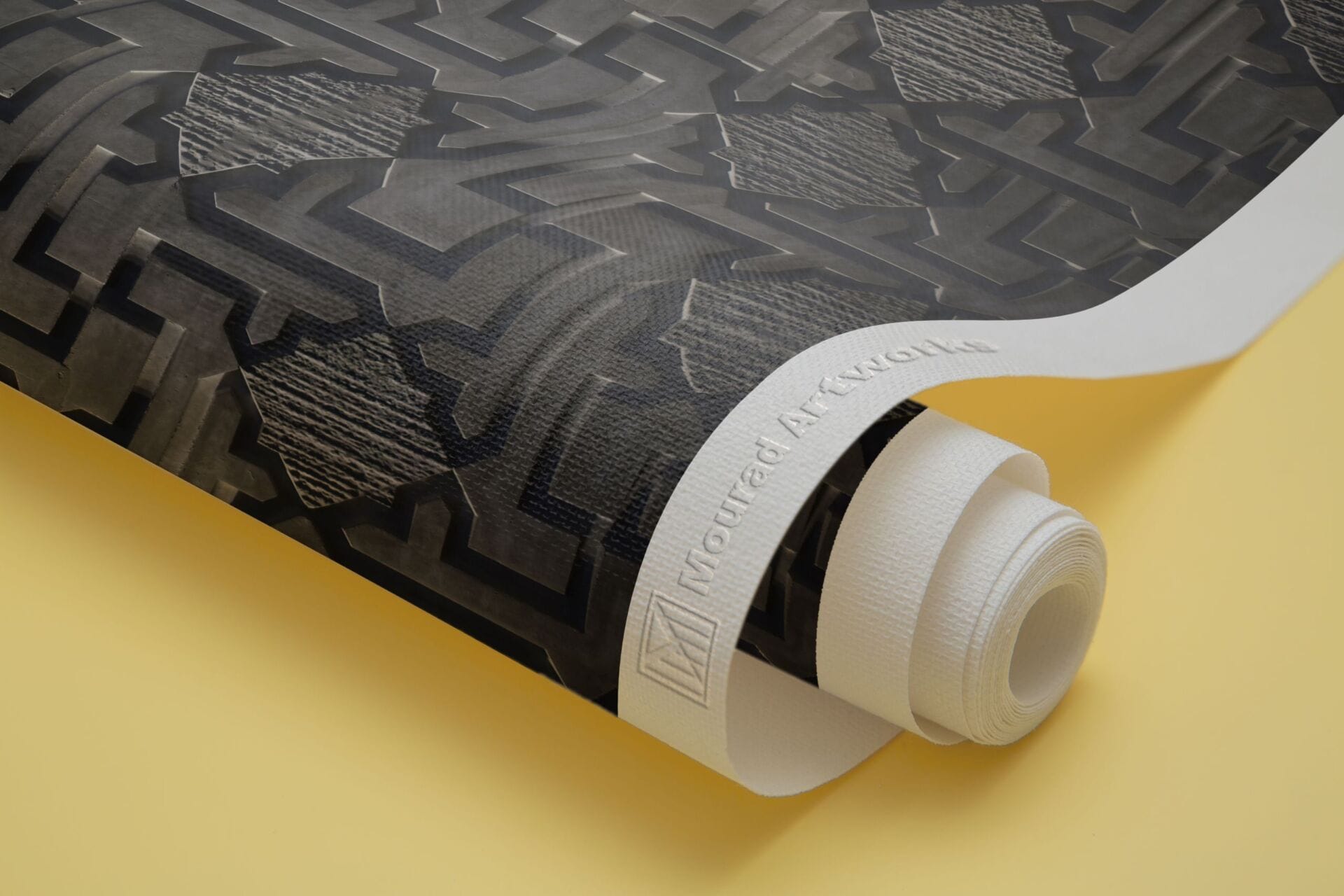 The Monolith cube with labyrinth pattern floating above concrete floor 4D Mural Wallpaper from Mourad Artworks is a modern and luxurious design element to any space, this wallpaper adds a touch of glamour and modernity to traditional and contemporary interiors alike.