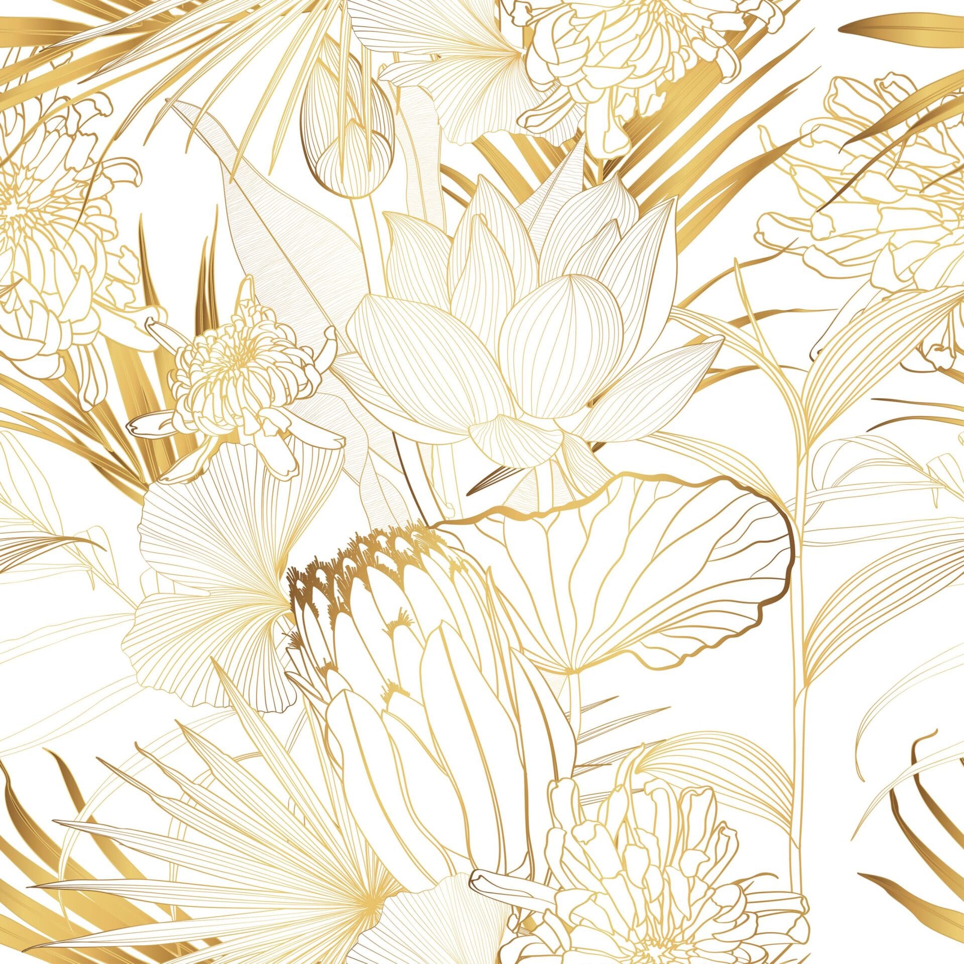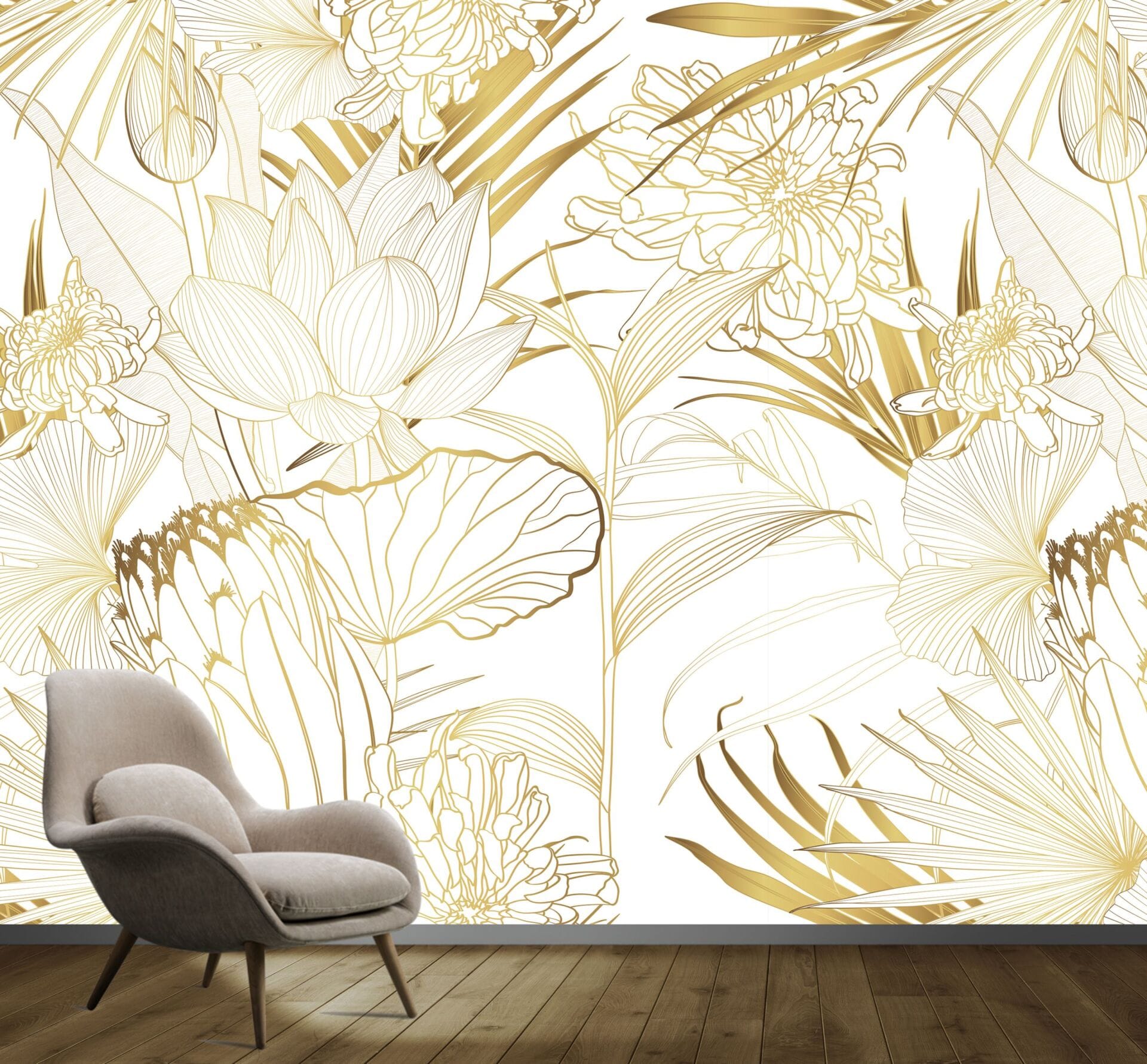 Bring the timeless elegance of nature into your home with our Gilded Botanicals 4D Mural Wallpaper. This exquisite design features delicate botanical illustrations, showcasing lush tropical foliage and elegant florals outlined in shimmering gold against a soft, neutral backdrop. The layered details create a captivating 4D effect, adding depth and a touch of luxury to your walls.