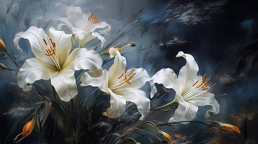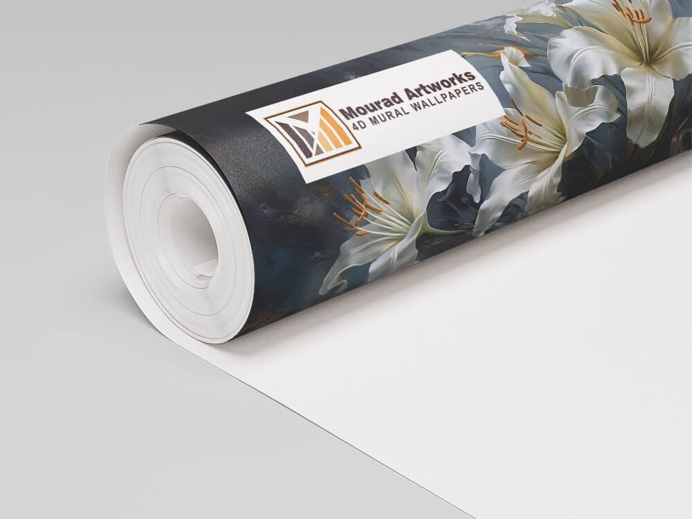 Introducing the Lux Nocturne Lily 4D Mural Wallpaper – Mourad Artworks' latest creation, where the mystique of night skies meets the elegance of blooming lilies. This mural embodies an air of opulence with its harmonious contrast of deep blues and vibrant whites, highlighted by golden stamens that command attention in any room.