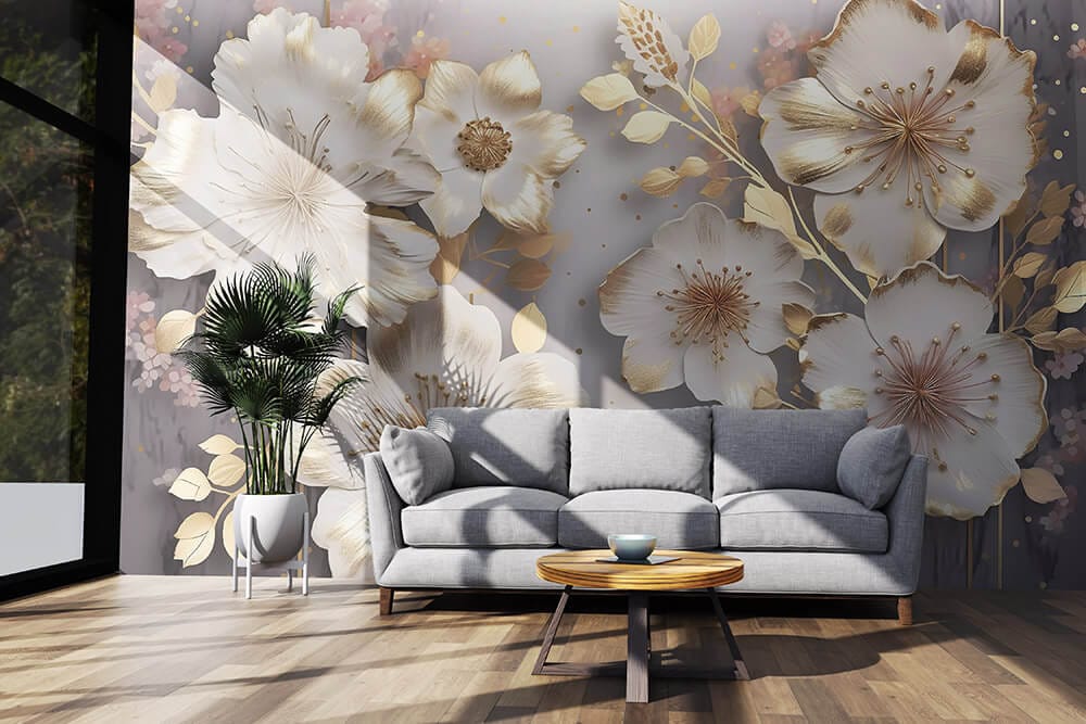The Whispering Petals 4D Mural Wallpaper by Mourad Artworks captures the essence of understated elegance. Featuring delicate flowers in soft, creamy hues, each blossom is highlighted with tasteful gold accents, creating a serene and inviting ambiance that complements any room. This mural's design is an ode to the beauty of quiet moments and nature's soft tones.