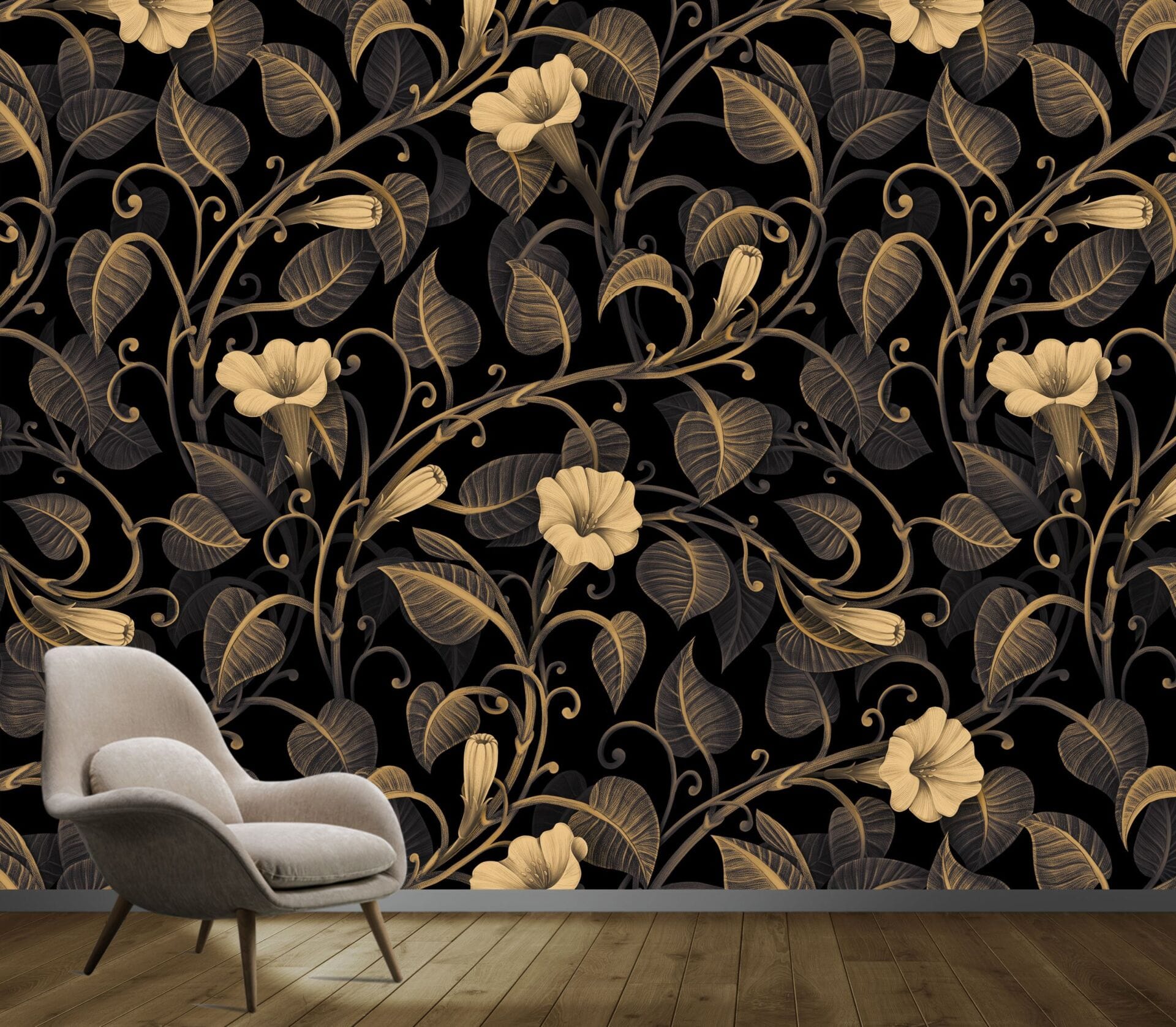 The Golden flowers on black background elegant floral 4D Mural Wallpaper from Mourad Artworks is a modern and luxurious design element to any space, this wallpaper adds a touch of glamour and modernity to traditional and contemporary interiors alike.