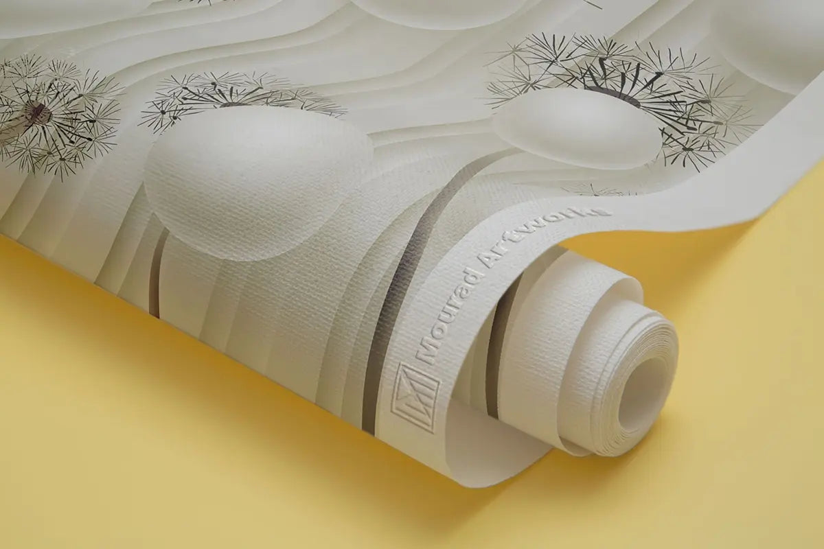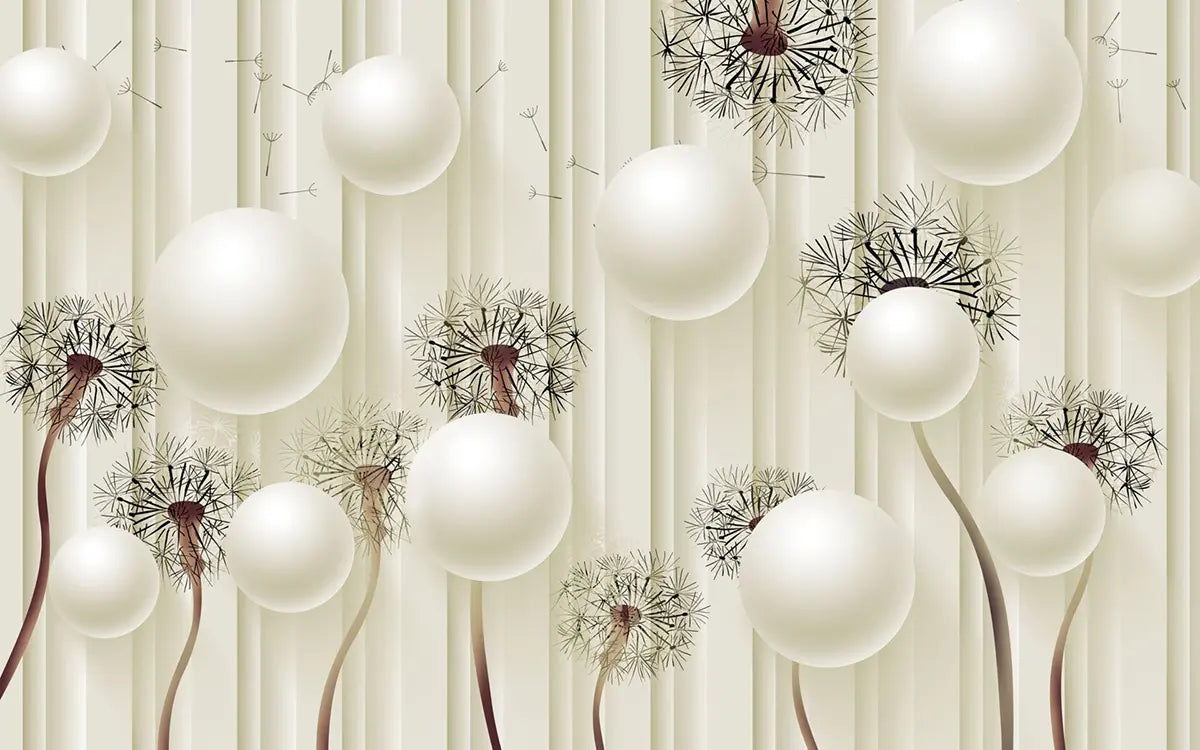 This ethereal wall mural showcases delicate dandelion seeds gracefully floating against a backdrop of soft, muted colors, creating a mesmerizing and tranquil atmosphere.
